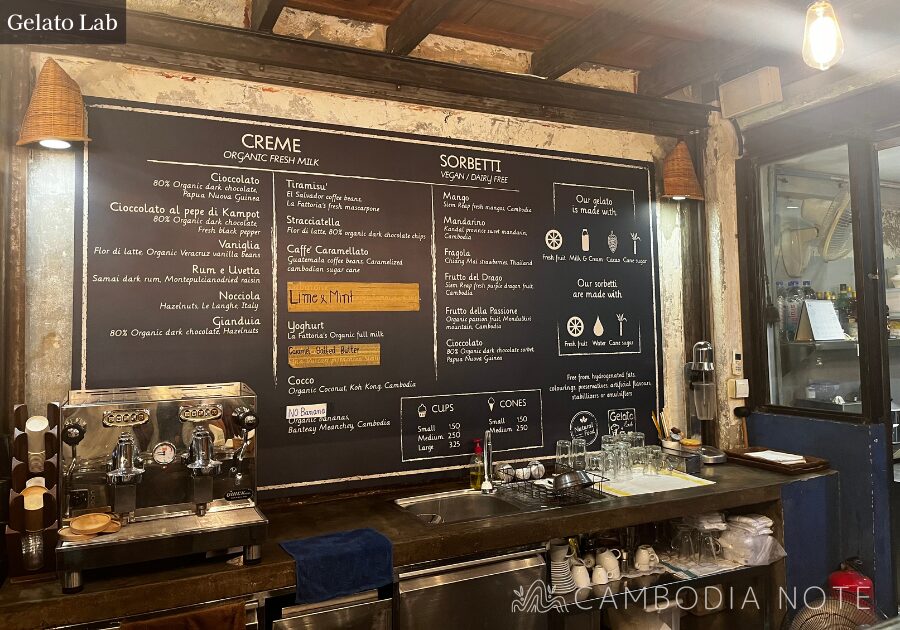 名物は、こだわり素材で作られた自家製ジェラート。カンボジア産のフルーツや食材を使ったフレーバーが豊富で、マンゴーやドラゴンフルーツといった爽やかな味から、チョコレートやナッツ系の濃厚な味まで幅広く揃っています。素材本来の風味がしっかり感じられる、本格派の味わいが魅力です。