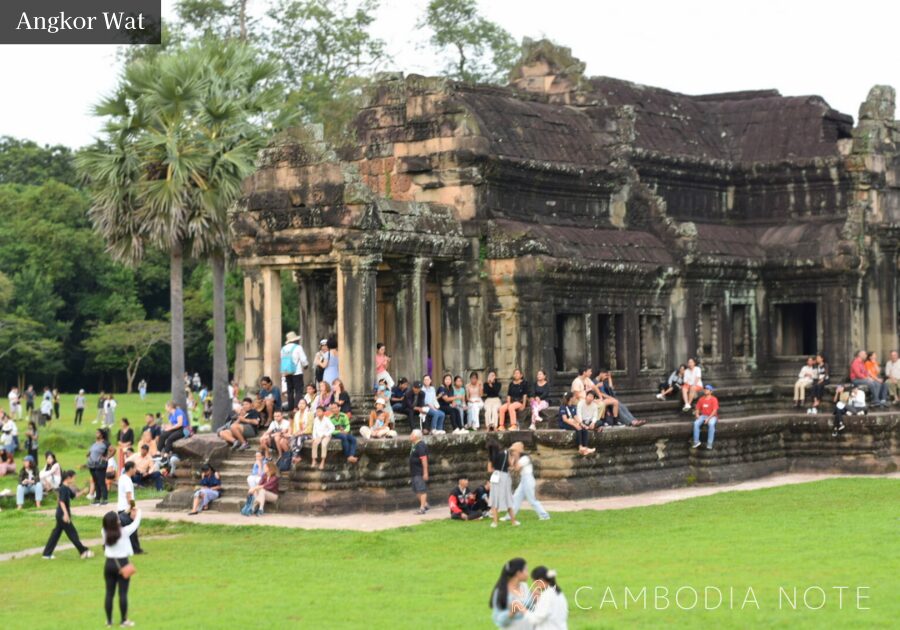 アンコール・ワットに到着してから、朝日が拝めるまでに少し時間があります。経蔵に腰掛けながら、日が昇るのを待つ人が多くいます。