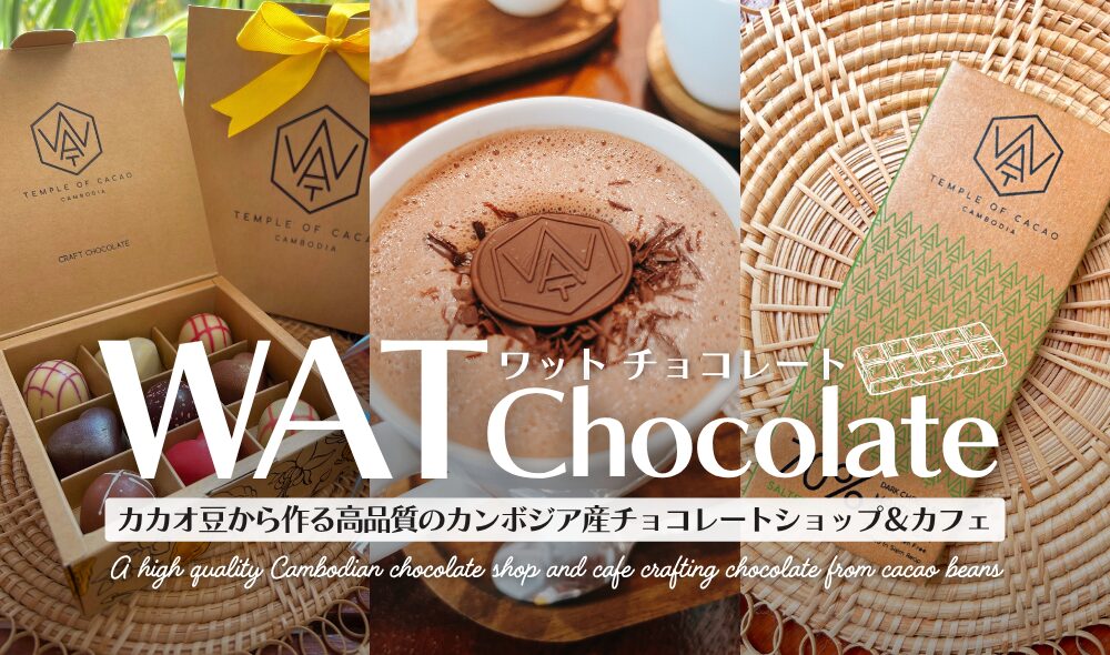 WAT Chocolateは、カンボジア産カカオを使用したクラフトチョコレートを楽しめるブランドで、シェムリアップでは工房見学・カフェ・お土産購入といったさまざまな体験ができます。ファクトリーでは製造工程を見学でき、リバーサイド店やAviary Square店ではカフェとして気軽に立ち寄れるのも魅力です。